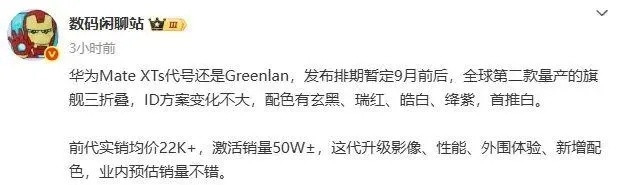 此外,该博主还曾透露“华为Mate XTs代号还是Greenlan,发布排期暂定9月前后,全球第二款量产的旗舰三折叠,ID方案变化不大,配色有玄黑、瑞红、皓白、绛紫,首推白。前代实销均价22K+,激活销量50W±,这代升级影像、性能、外围体验、新增配色,业内预估销量不错。”从曝光的信息来看,该机的外观与上代应该变化不大,而在处理器、影像方面会带来明显提升。