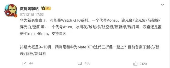 另外,此前,数码博主“数码闲聊站”也曾爆料称,“华为新表备案了,可能是Watch GT6系列,一个代号Konsu,鎏光金/流光紫/马鞍棕/浮光白/魅影黑;一个代号Atum,冰川灰/琥珀棕/钛空银/原野绿/雅丹黑,表盘还是覆盖41mm-46mm,支持星闪 排期大概是9-10月,猜测是和华为Mate XTs迭代三折叠一起上?目前备案了新机/新表/新板/新耳机”。